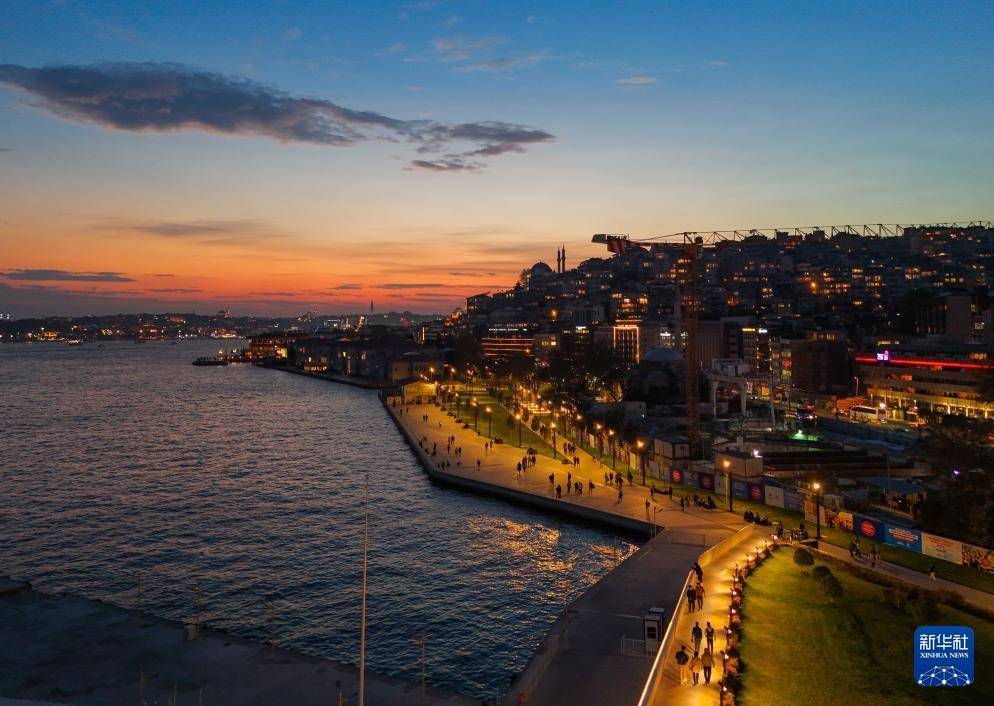 这是11月20日拍摄的在土耳其伊斯坦布尔博斯普鲁斯海峡欧洲一侧夜景(无人机照片)。
