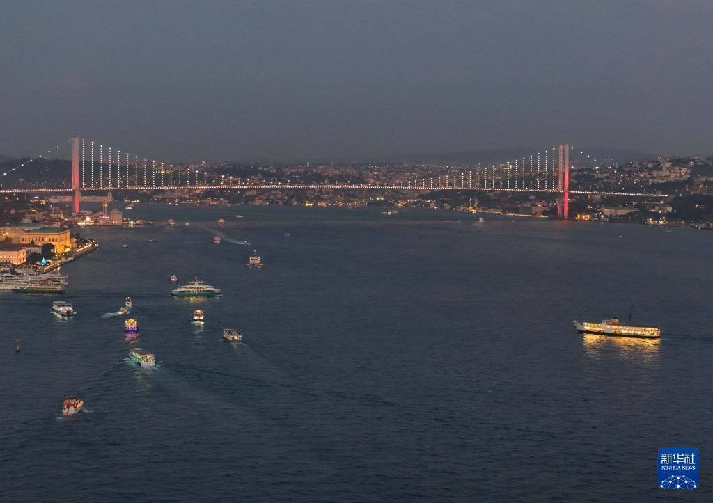 r夜幕降临,博斯普鲁斯海峡上船只穿梭,两岸灯火璀璨。